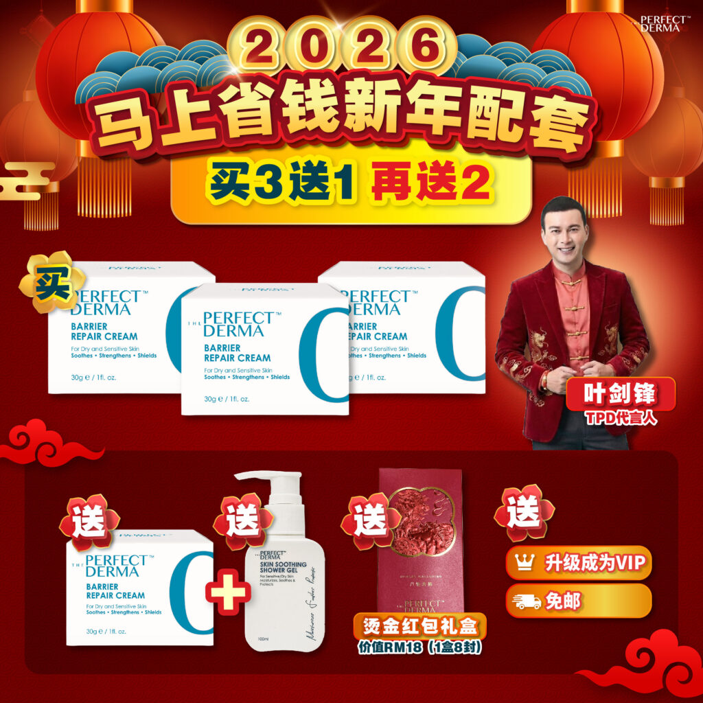 🧧🐎【配套 A】 . 【买 3 送 1 再送 2】 买 3 罐 Barrier Repair Cream (30g) 🎁送 1 罐 Barrier Repair Cream (30g) 🎁送 1 支 TPD Shower Gel (100ml) 🎁送 1 盒 The Perfect Derma 烫金红包礼盒(价值 RM18,1盒 8 封) 👑免费升级成为VIP 🚚免邮