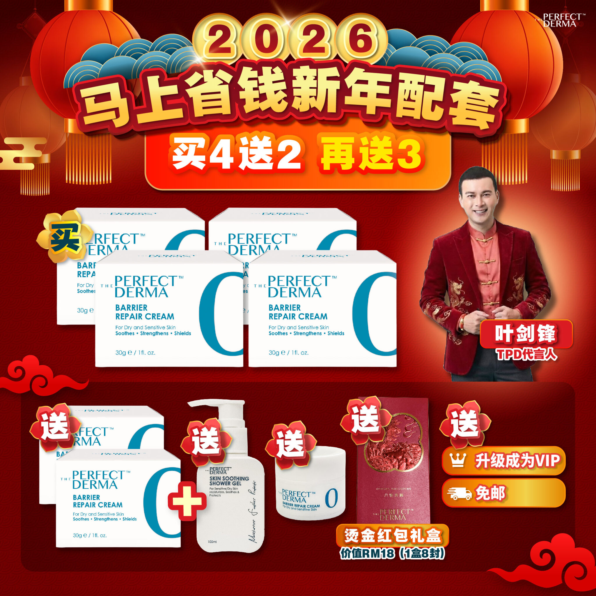 🧧🐎 【配套 B】 . 【买 4 送 2 再送 3】 买 4 罐 Barrier Repair Cream (30g) 🎁送 2 罐 Barrier Repair Cream (30g) 🎁送 1 支 TPD Shower Gel (100ml) 🎁送 1 罐 Barrier Repair Cream (5g) 🎁送 1 盒 The Perfect Derma 烫金红包礼盒(价值 RM18,1盒 8 封) 👑免费升级成为VIP 🚚免邮